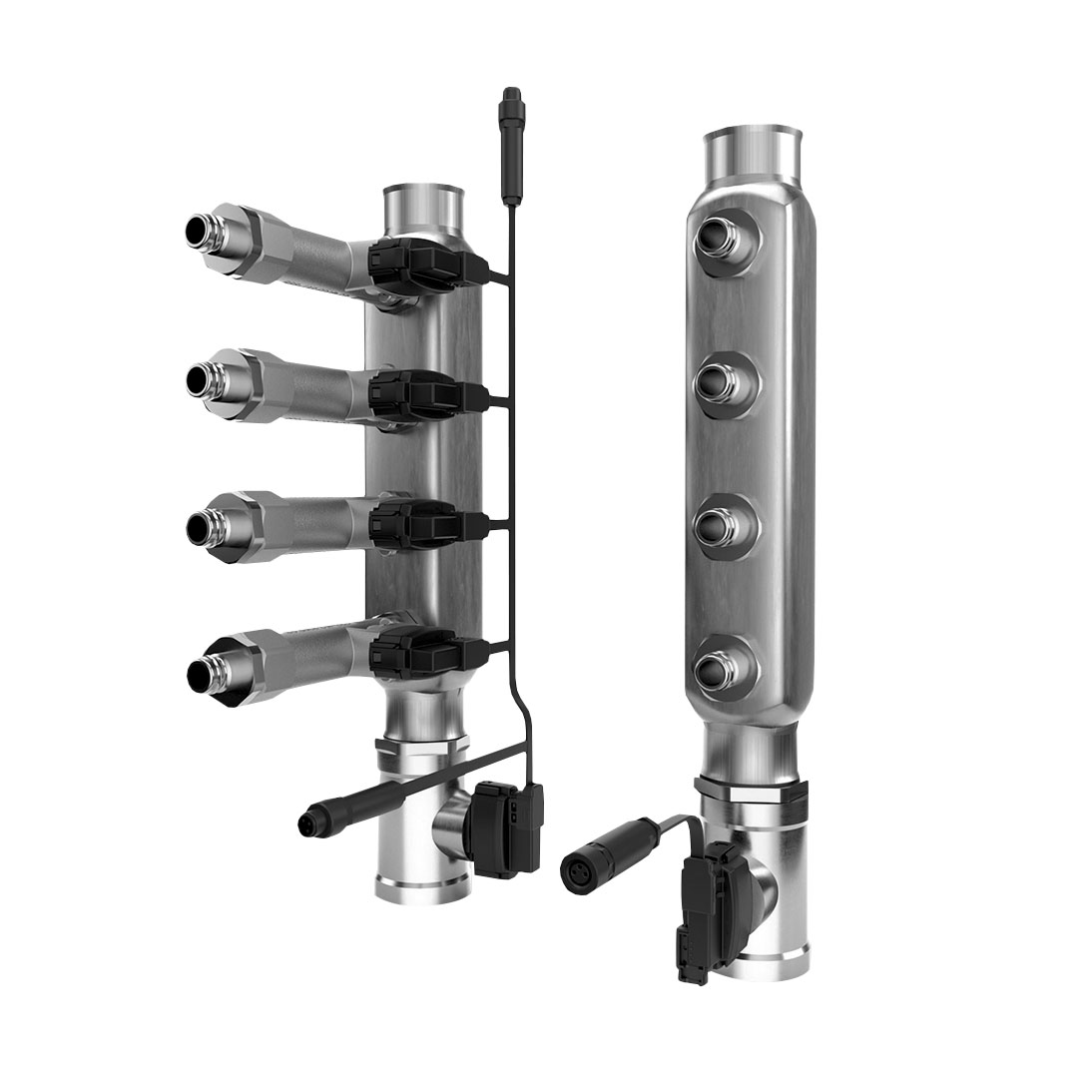 Edelstahlverteiler mit integrierten Durchflusssensoren.
