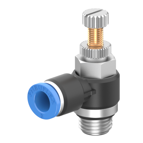 Das JSC-B - Push In Male Elbow Flow Control - In Valve ist ein wichtiges Anschlussstück für End-of-Arm-Tooling-Systeme, das eine präzise Steuerung des pneumatischen Luftstroms ermöglicht. Dieses winkelförmige Anschlussstück mit integr